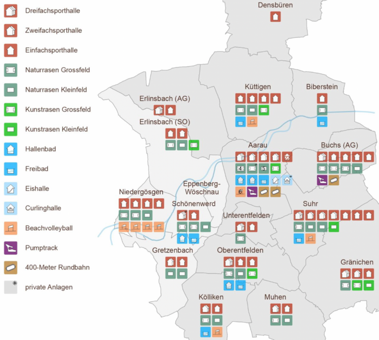 Im RESAK aarau regio ist für Suhr westlich der Badi (neuer Badiweg) eine unbebaute Fläche von mehr als 10000 m2 als Potential für ein Rasensportfeld oder Hallenbad bezeichnet und östlich der Badi eine unbebaute Arbeitszone von über 17000 m2 für 2 Rasensportfelder.